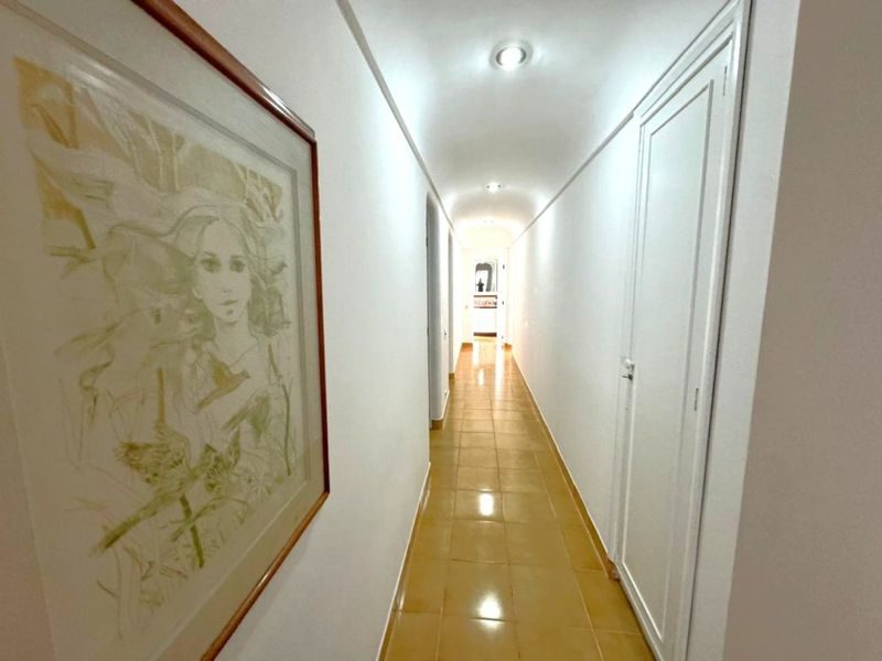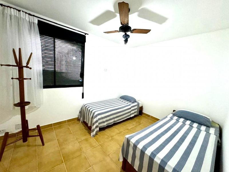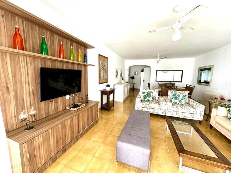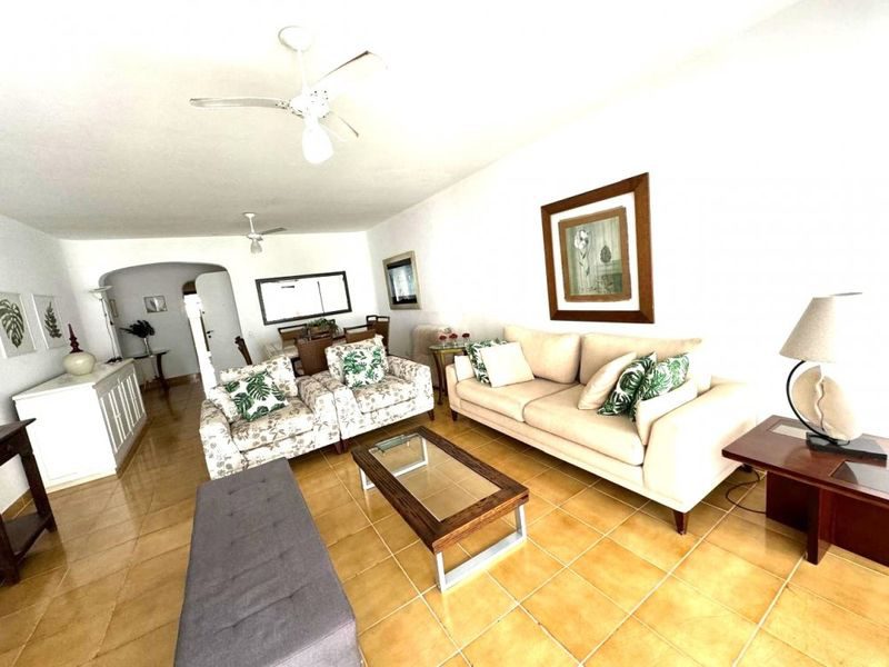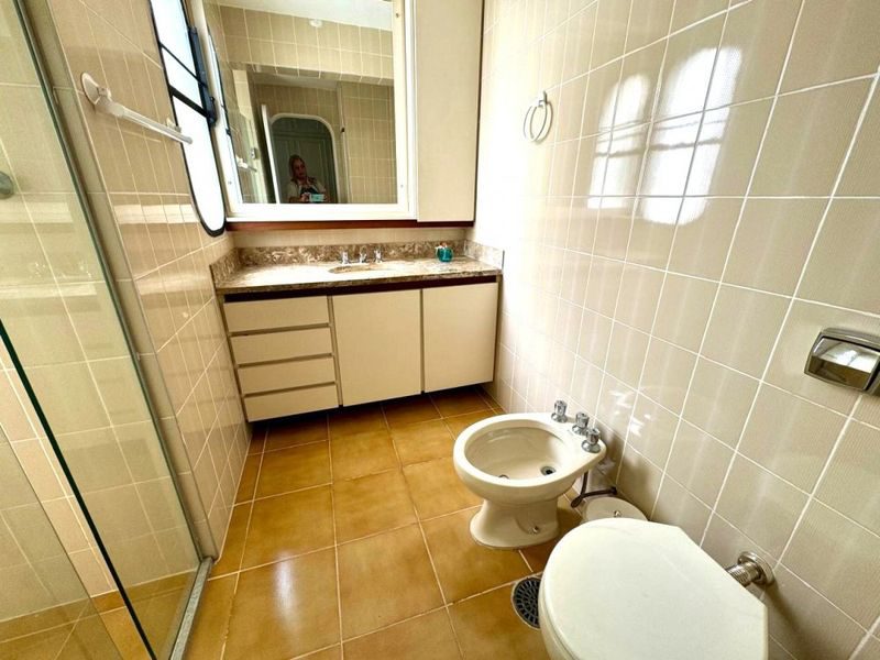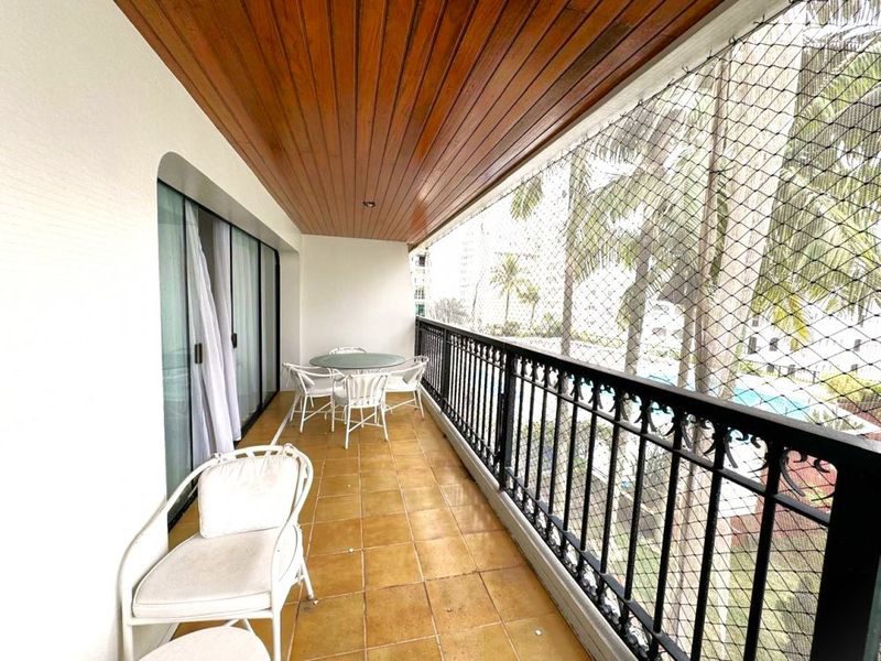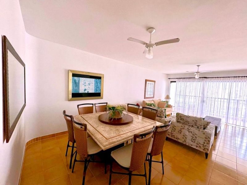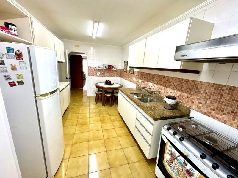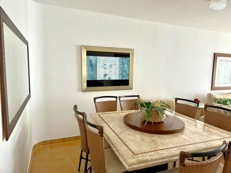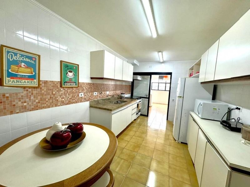 Sala ampla com 2 ambientes, sacada com vista para o mar, 3 dormitórios sendo 1 suíte + dependência de empregada, copa, cozinha com armários, área de serviço, banheiro social, banheiro de serviço, lavabo e 2 vagas de garagem.