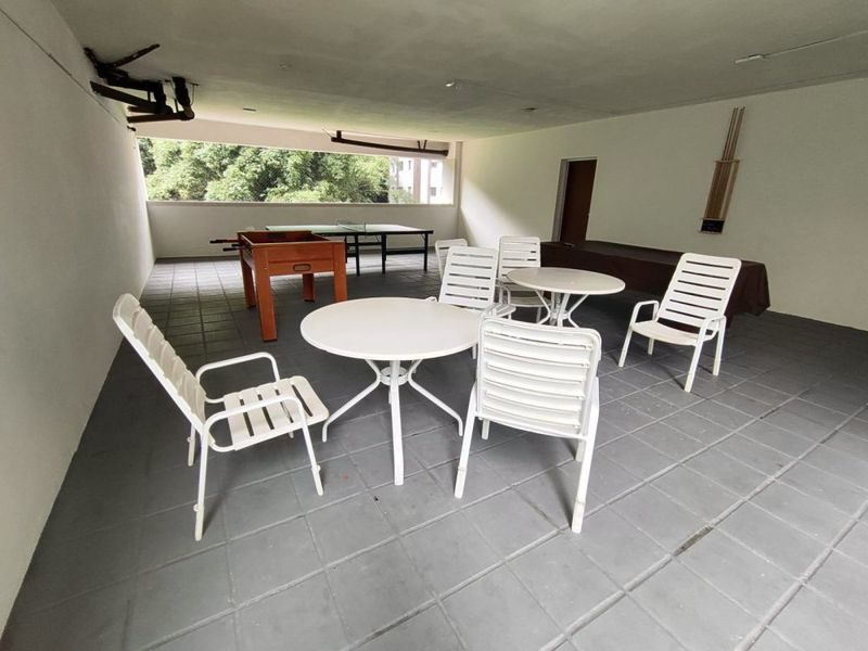 Prédio com elevador, serviço de praia, piscina, churrasqueira e quadra de futebol.