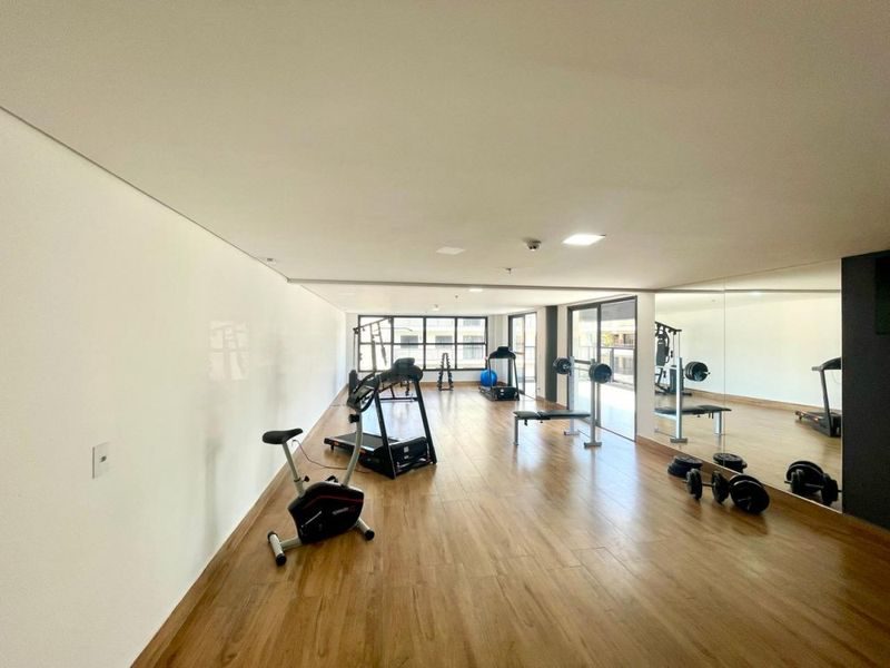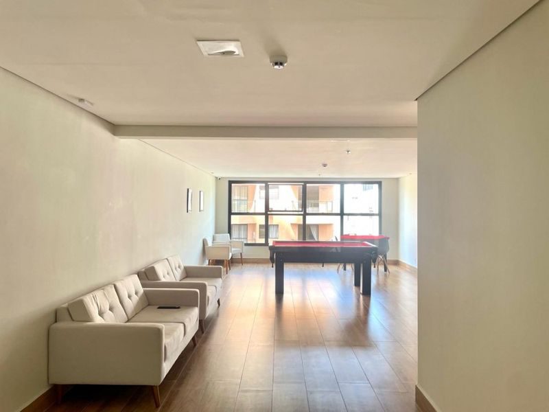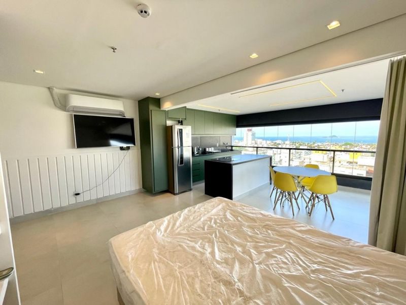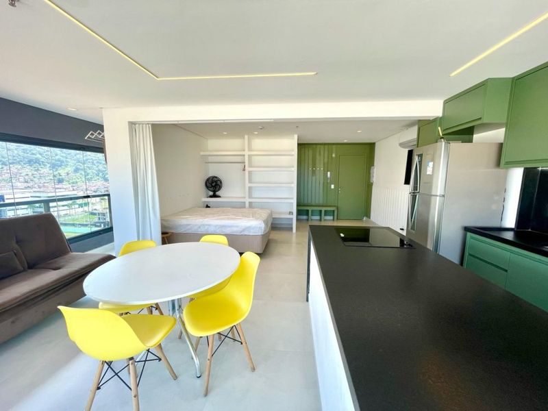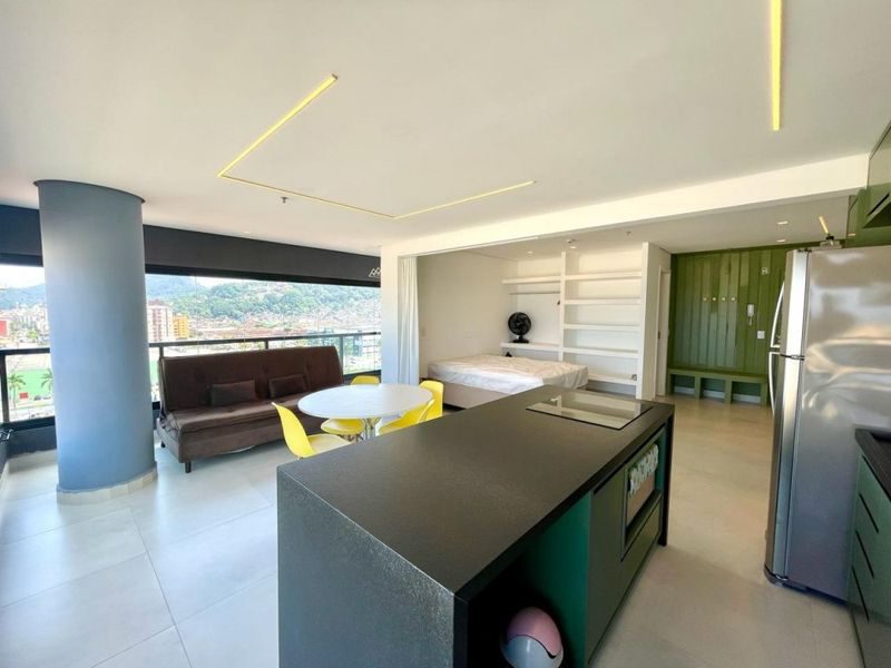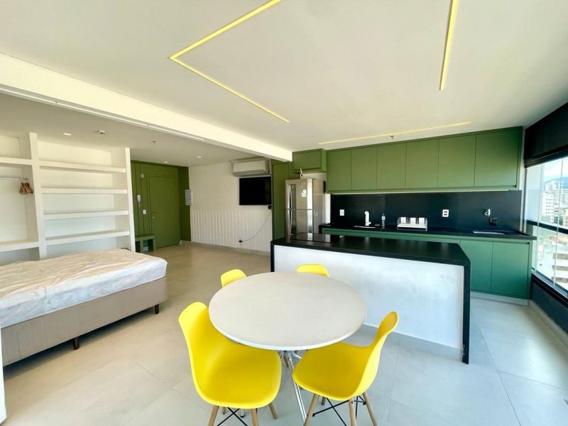 Apartamento Stúdio de 48 m², mobiliado, com 1 dormitório, sala, cozinha com armários, área de serviço, 1 banheiro e 1 vaga garagem.