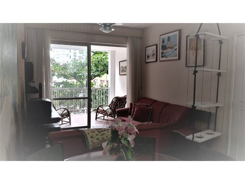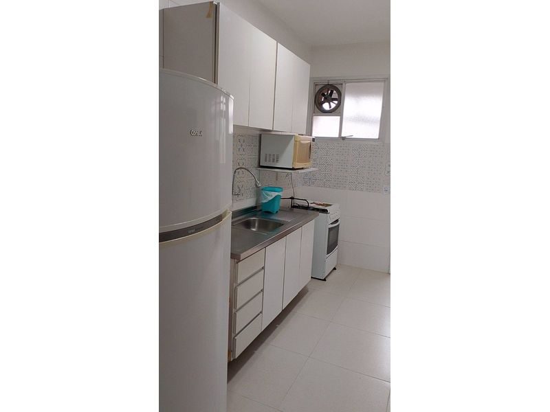 Mobiliado, 2 dormitórios + dependência de empregada, sala para 2 ambientes, sacada, cozinha com armários, 1 banheiro social e 1 banheiro de serviço.