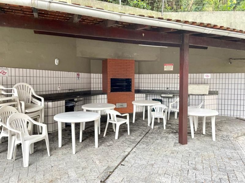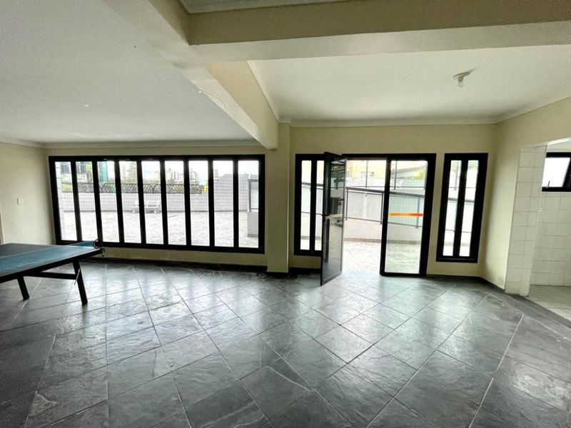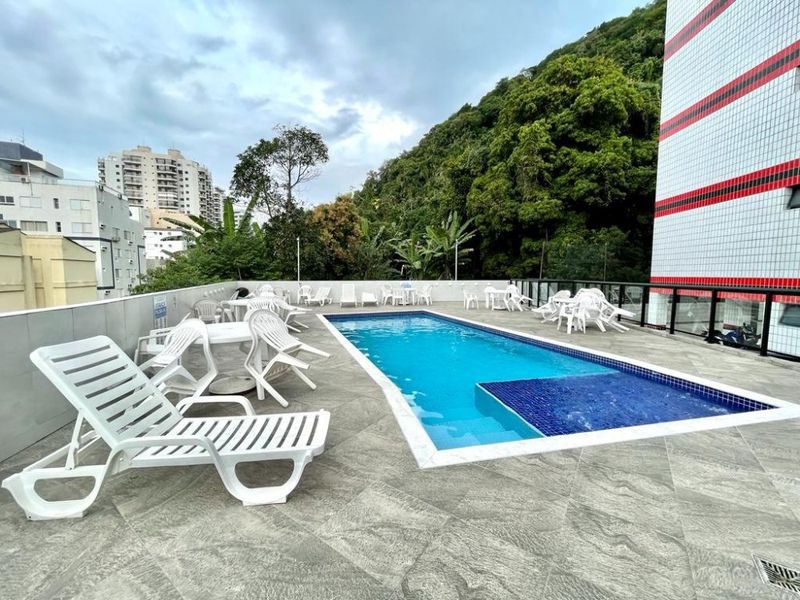 Prédio com elevador, serviço de praia, área de lazer, com piscina, churrasqueira, salão de festas e campo de futebol.
