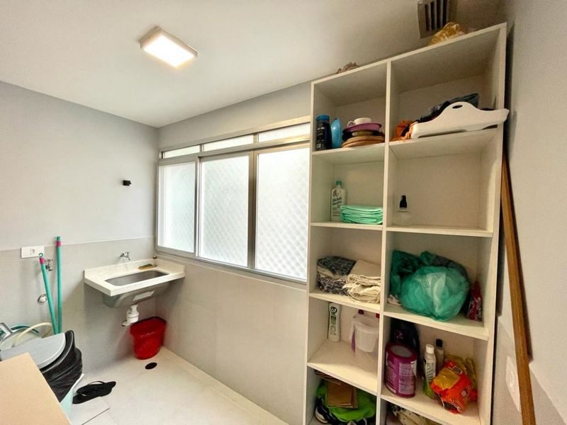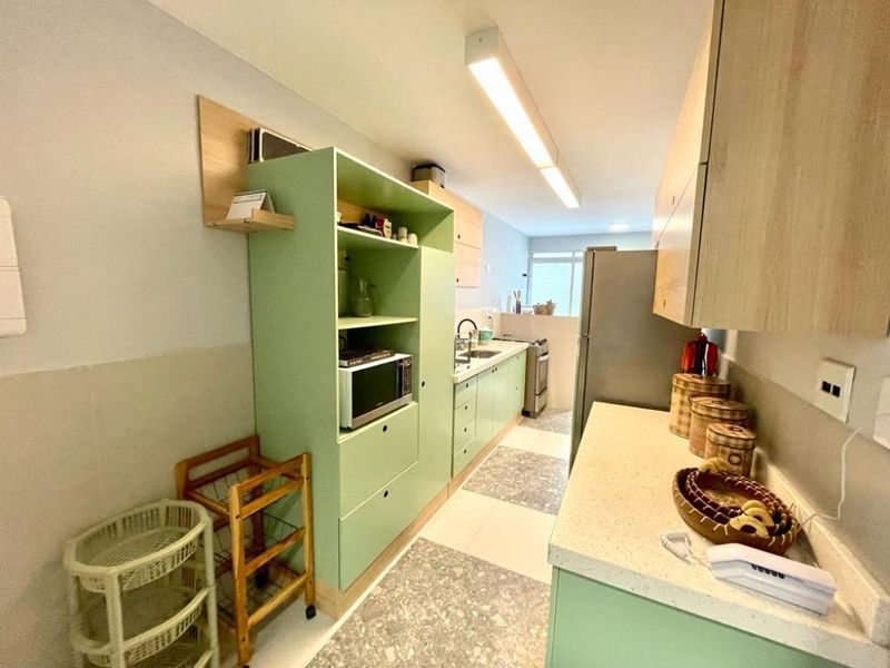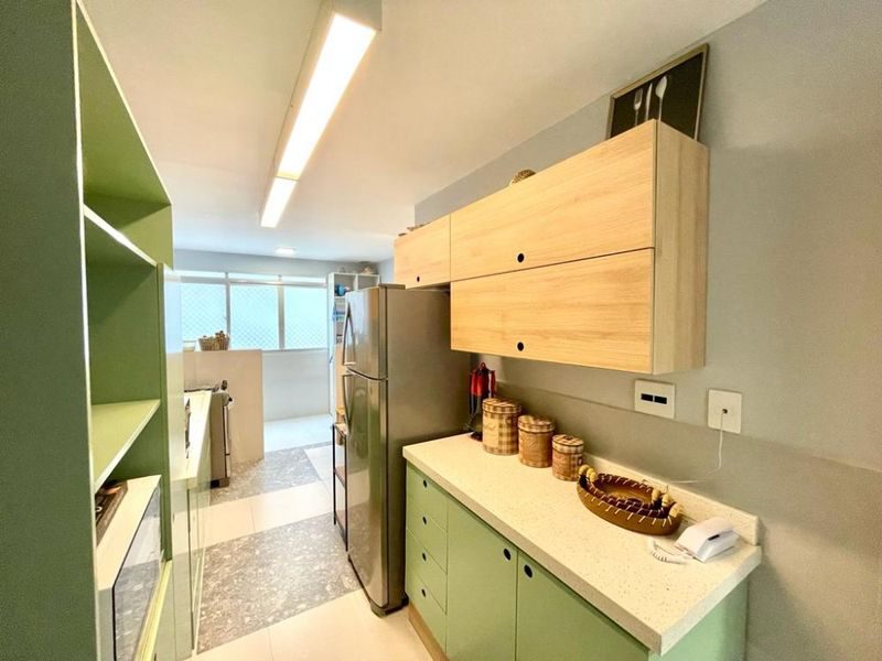 Sala 2 ambientes com sacada, cozinha com armários, área de serviço, banheiro social e banheiro de serviço.