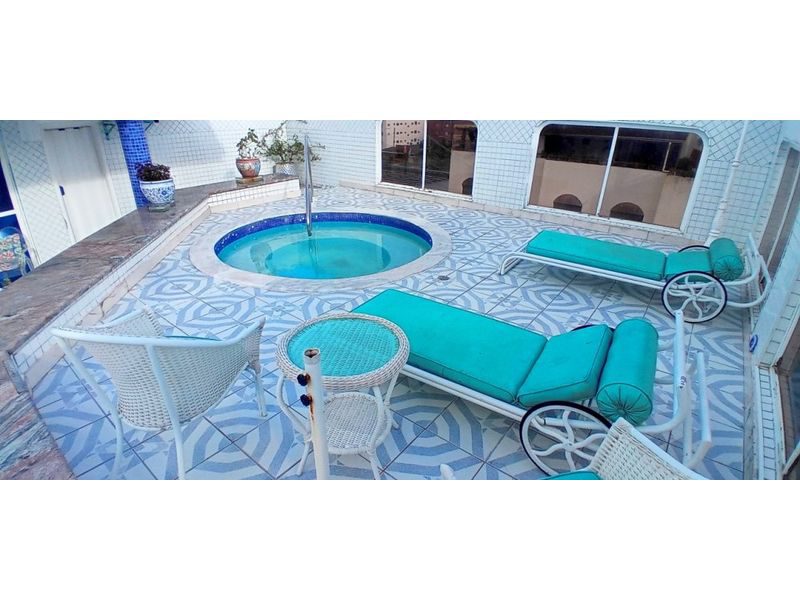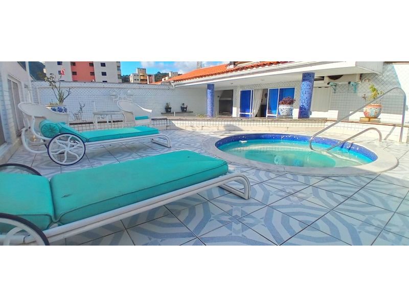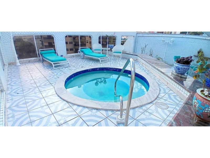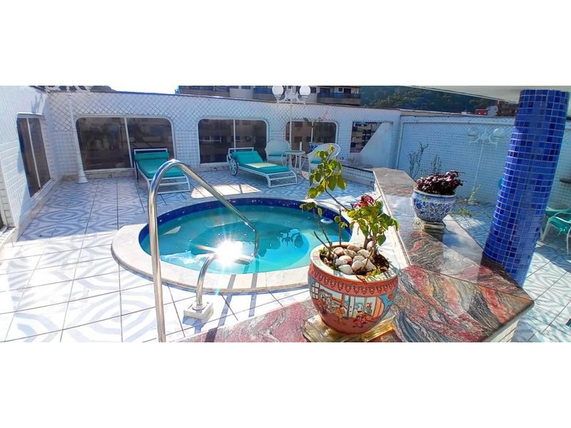 Linda cobertura na Praia da Enseada, reformada, mobiliada, decorada, piscina privativa, churrasqueira, solarium, 3 dormitórios sendo 1 suíte + dependência de empregada, banheiro social, ampla sala para 2 ambientes, cozinha com armários, área de serviço, banheiro de serviço e 2 vagas de garagem.