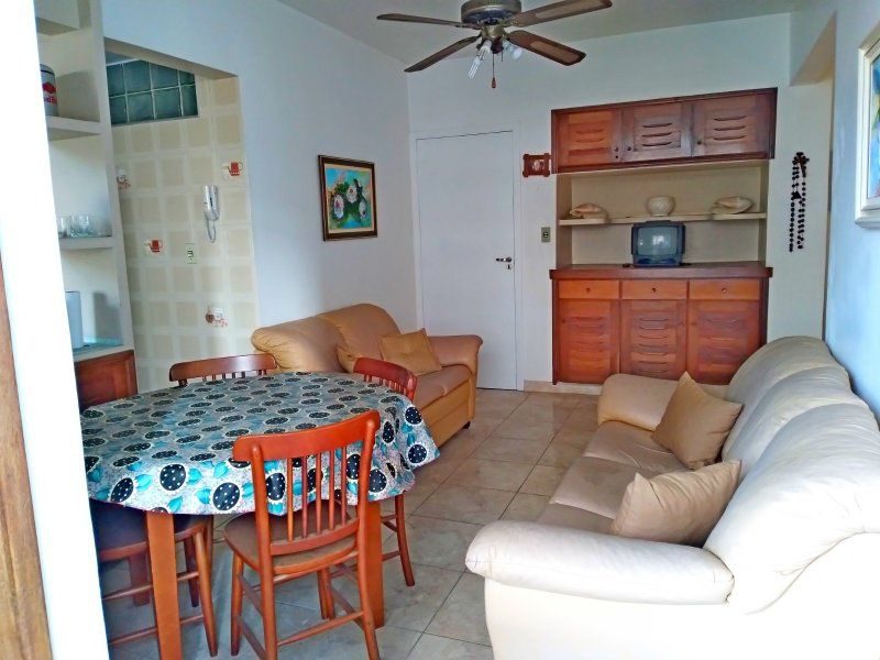 2 dormitórios, mobiliado, 1 banheiro social, ampla sala, cozinha com armários, área de serviço, sacada, portaria 24 horas, elevadores, serviço de praia .
