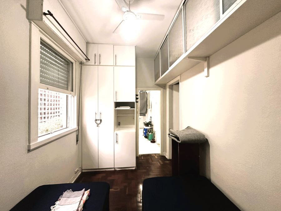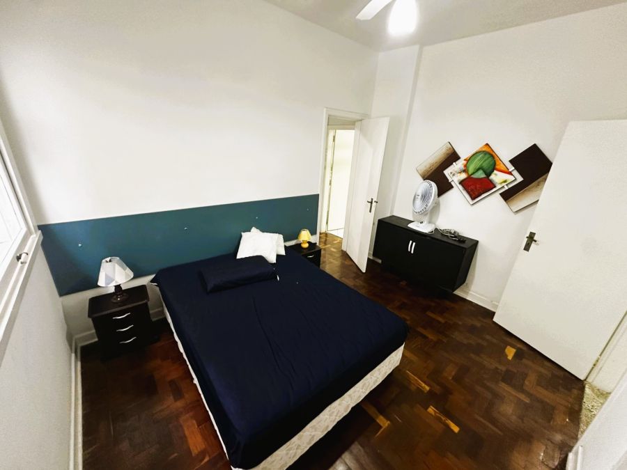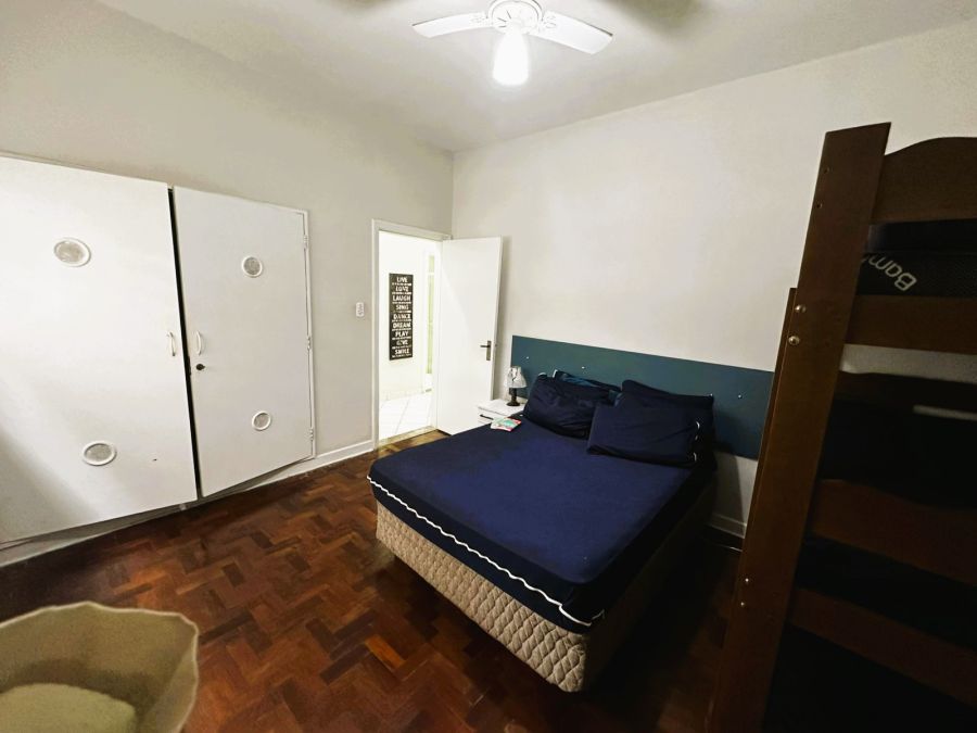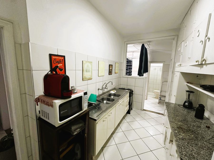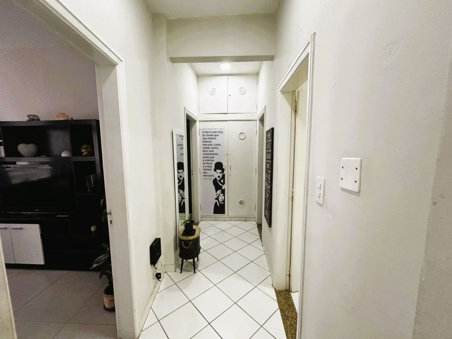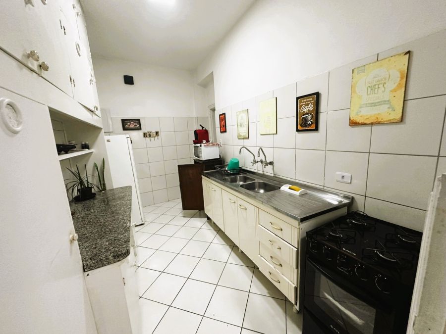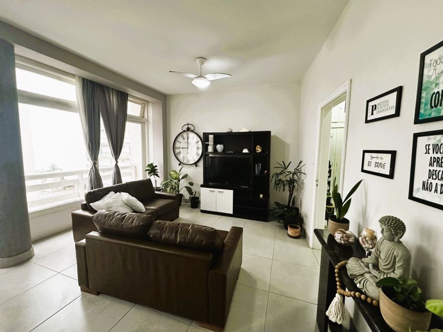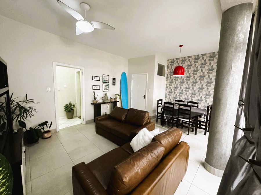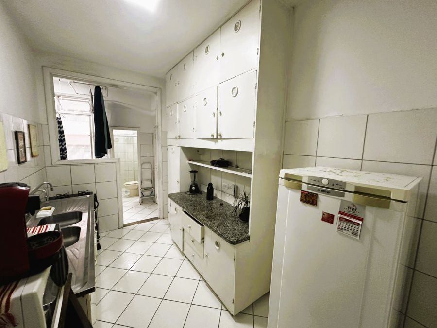 Apartamento com 2 dormitórios, sala ampla com vista parcial para o mar, cozinha, dependência de empregada, área de serviço, 2 banheiros e 1 vaga de garagem.
