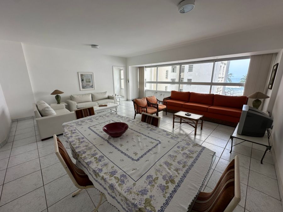 Sala ampla para 2 ambientes, sacada com vista parcial para o mar.