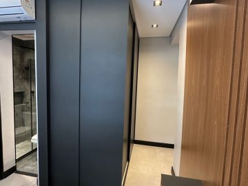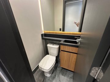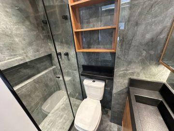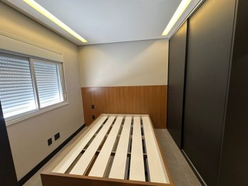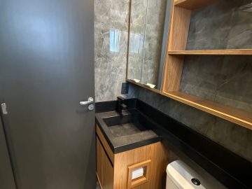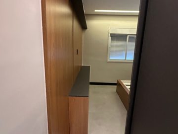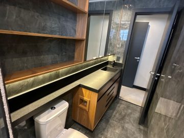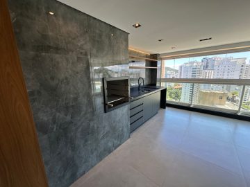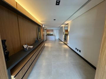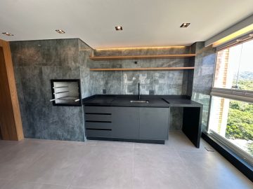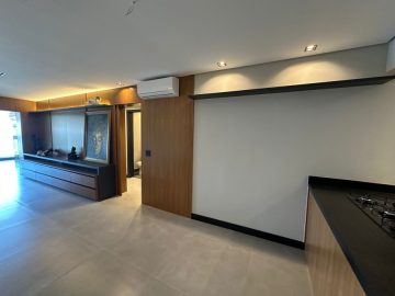 O apartamento está semi mobiliado e tem o acabamento de primeira, com pisos em porcelanato, ar condicionado, louças de qualidade, varanda envidraçada, móveis planejados e projeto de iluminação com teto rebaixado.