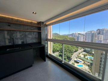 Varanda gourmet com churrasqueira a carvão, pia com gabinete e uma maravilhosa vista para a praia das Astúrias