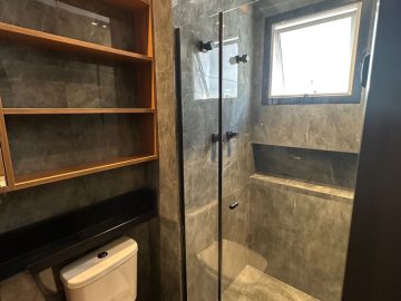 Os três banheiros das suítes têm pia esculpida, gabinete com armários e box blindex