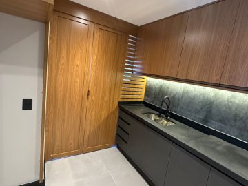 Lavanderia acoplada à cozinha, com armários e aquecedor à gás