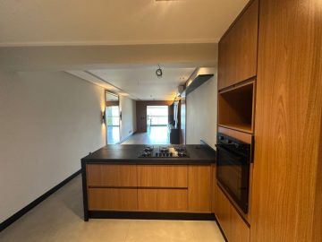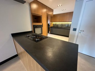 Cozinha americana com móveis planejados, cooktop,, forno elétrico, etc