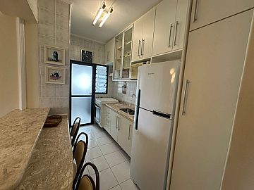 Cozinha com armários e área de serviço.