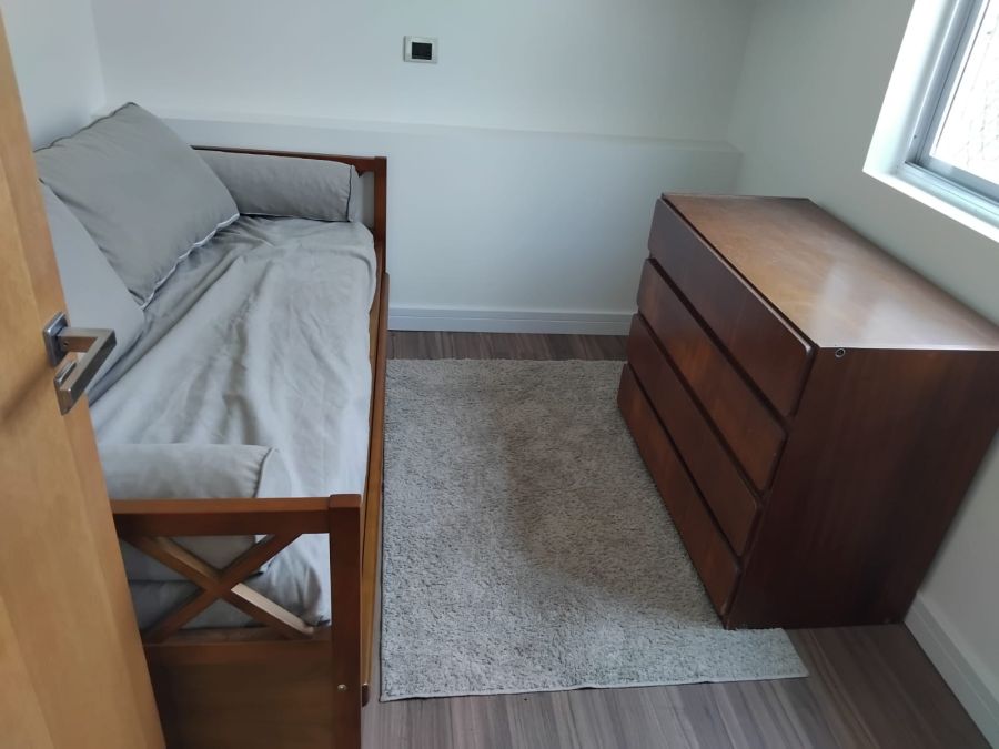 A área íntima é composta por dois dormitórios, sendo uma suíte que preserva a privacidade e o descanso dos moradores. Ao todo, o imóvel dispõe de três banheiros, garantindo funcionalidade para a família e visitantes. A estrutura interna é complementada por uma área de serviço completa, que inclui banheiro dedicado e dependência de empregada, detalhe que reforça a amplitude e a versatilidade da planta.