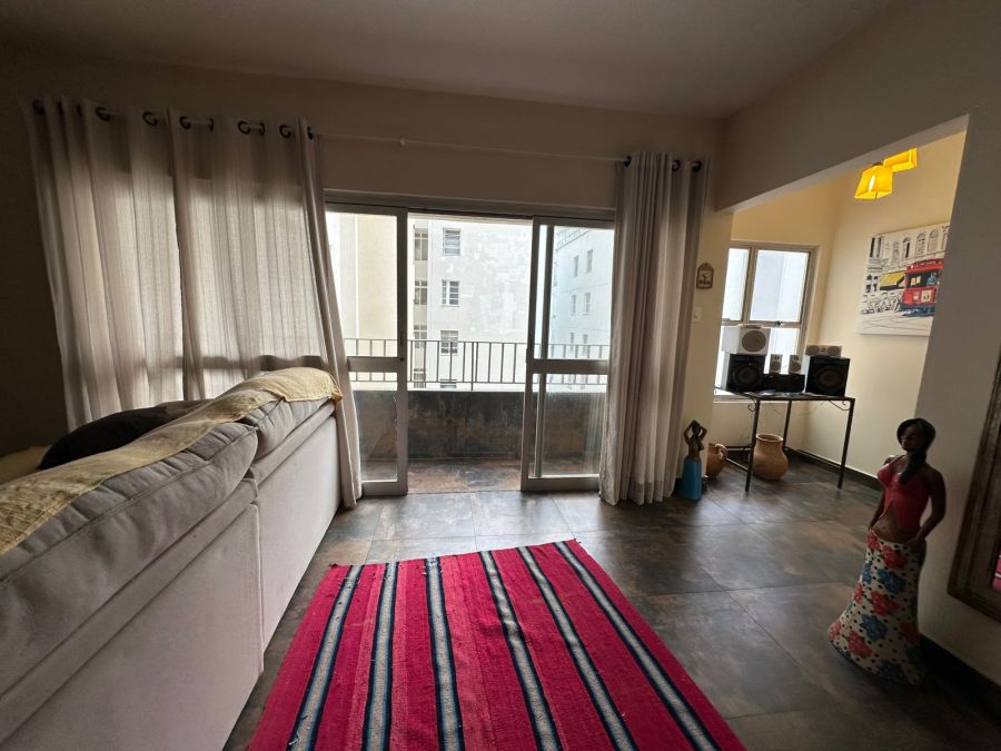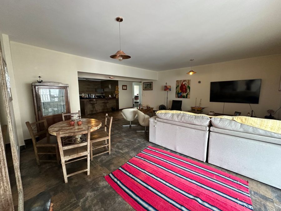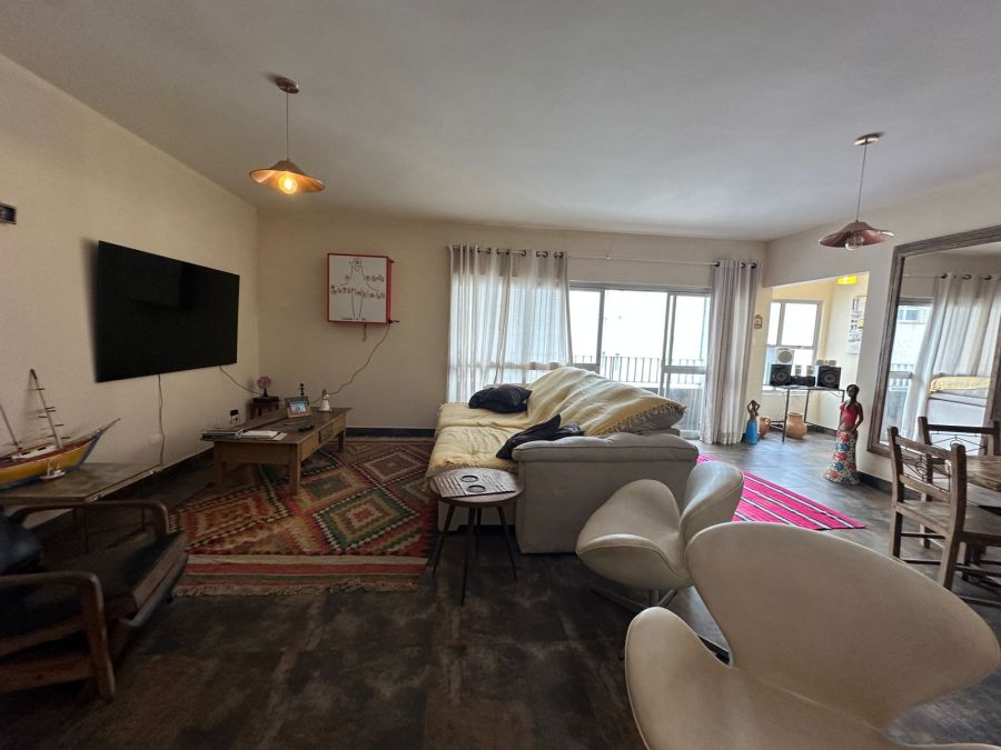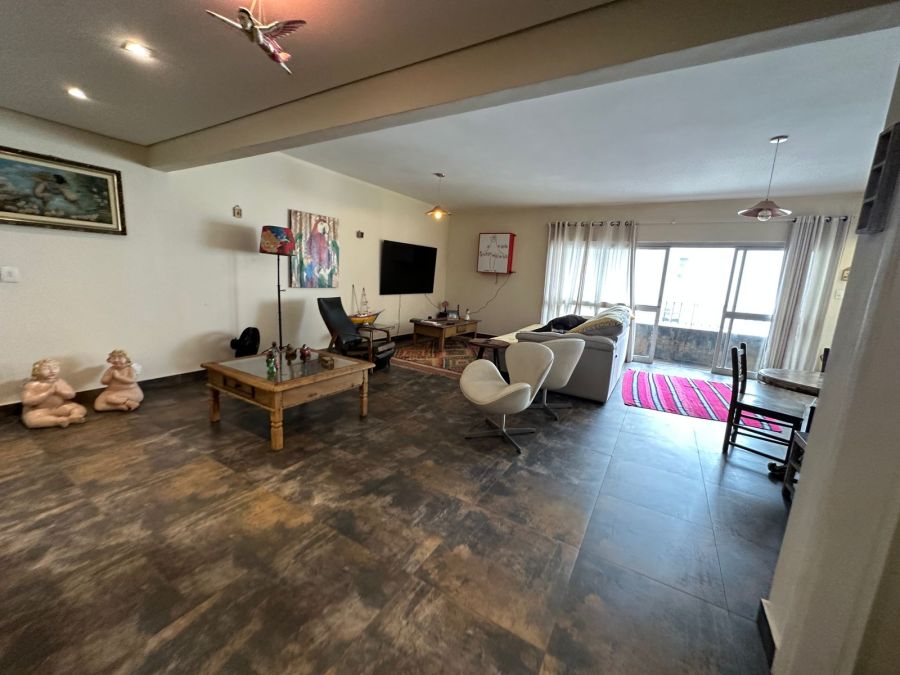Sala ampla para 2 ambientes, sacada com vista parcial para o mar.